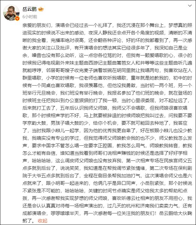 8月5日凌晨,相聲演員岳云鵬發(fā)長文,回顧自己開演唱會經(jīng)歷。
