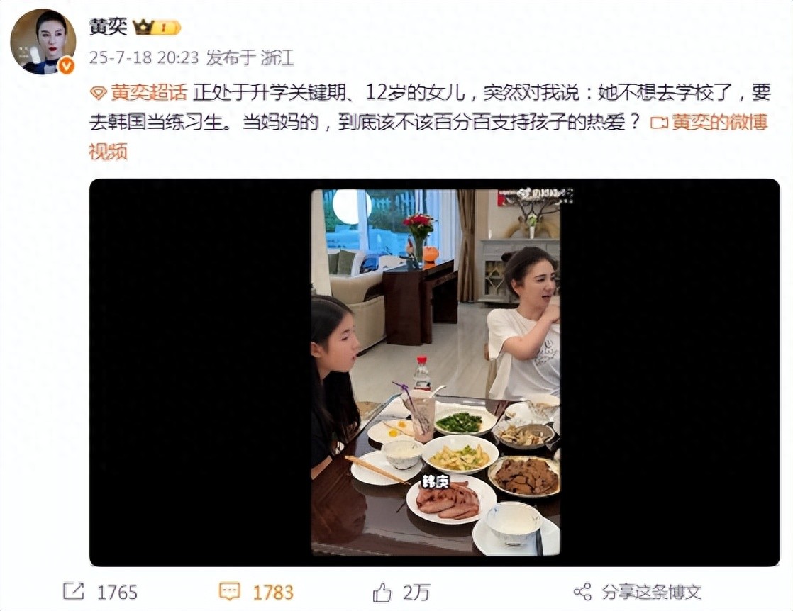 在黃奕回應網傳女兒出道傳聞之前,她曾發文透露12歲鐺鐺想去韓國當練習生,并且還不想去讀書了。當時黃奕的發文一出,就引起了不小的爭議,但都沒有則此的質疑聲大。