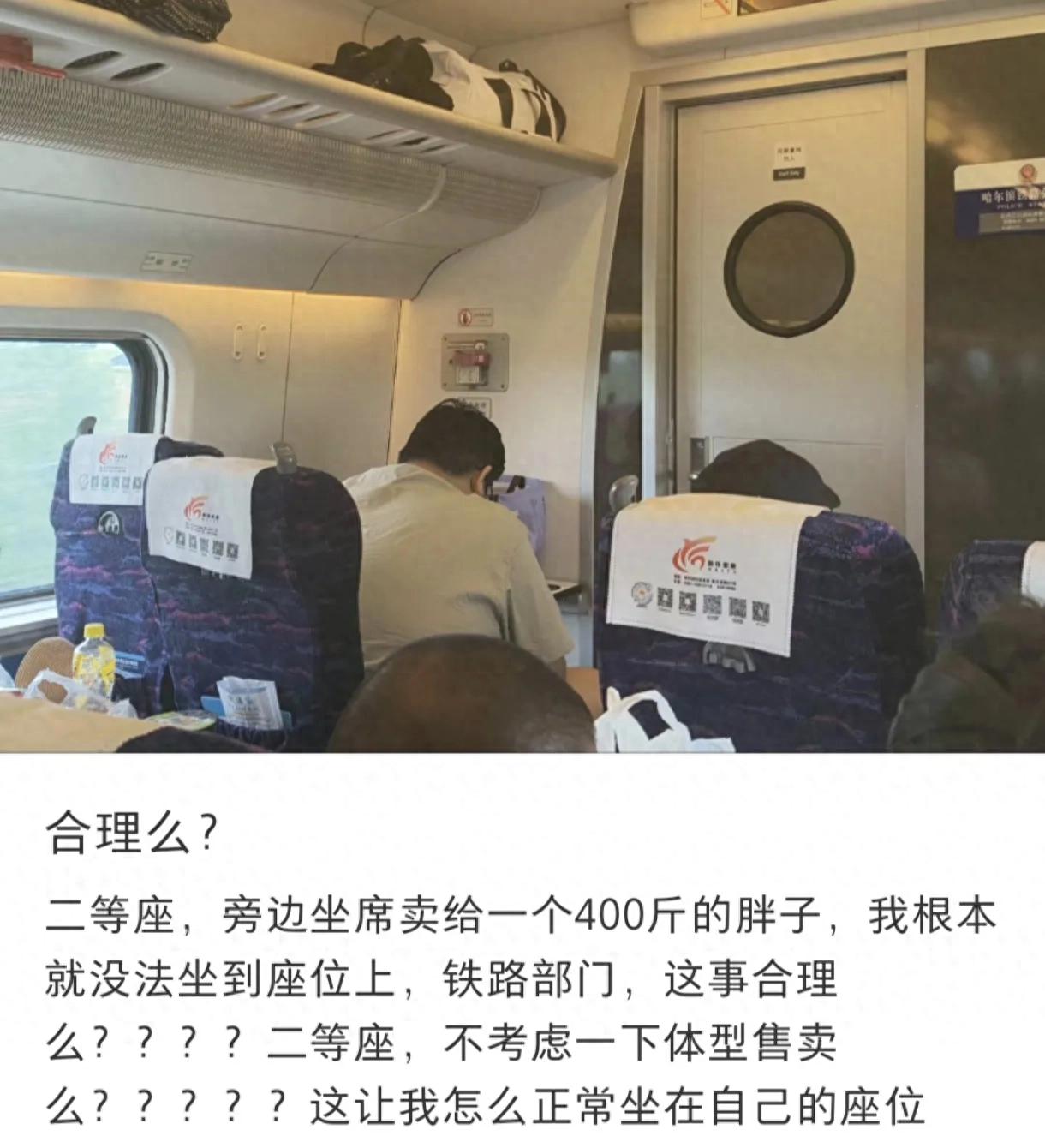 最近有網友吐槽,她坐高鐵二等座,鄰座是位約400斤的大哥,體型寬得把她的座位擠得只剩條縫,“根本坐不進去”,還拍了照問:“鐵路售票就不能考慮考慮體型差異嗎?”