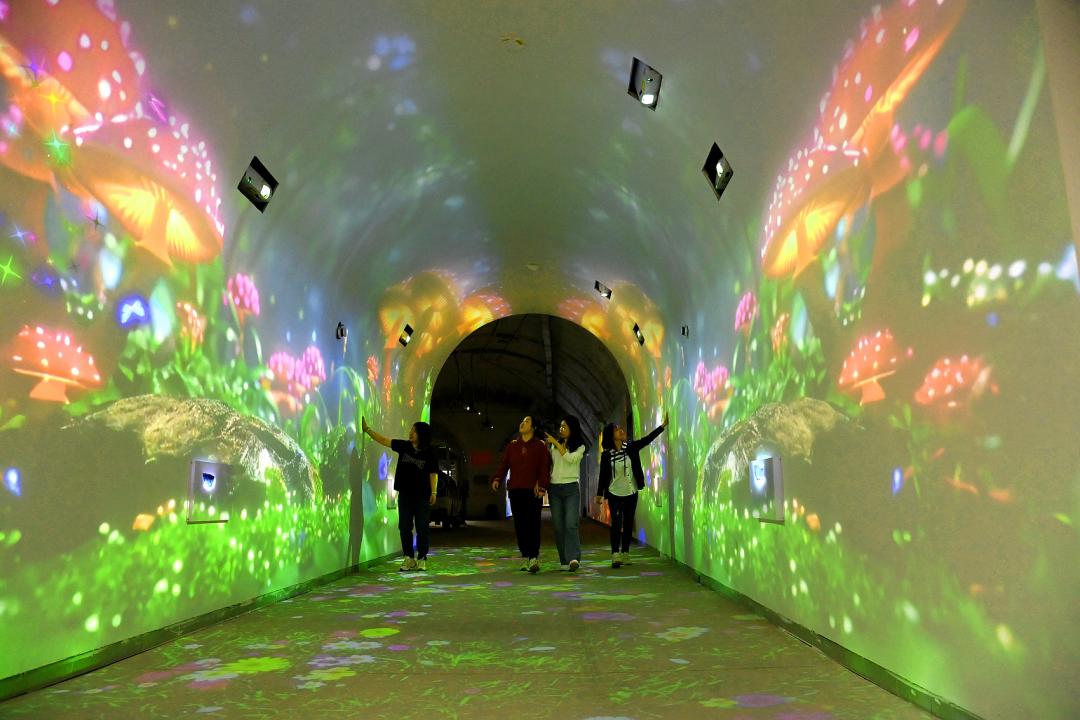 石家莊通山工程直接變成一個“地下游樂園”,面積相當(dāng)于10個標(biāo)準(zhǔn)足球場大小。外面熱浪滾滾,里面涼風(fēng)習(xí)習(xí),小朋友能坐小火車穿過昔日的戰(zhàn)備長廊,還能玩模擬足球、模擬籃球、皮影戲等互動游戲,20多個項目隨便選。