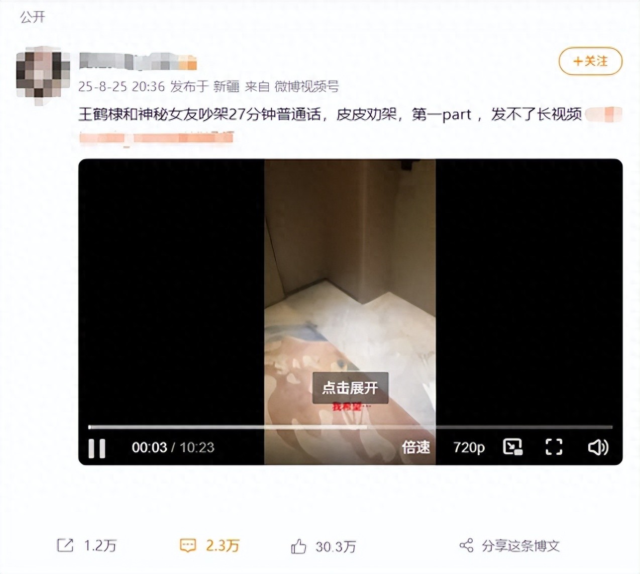 昨天(8月25日),有網(wǎng)友在社交平臺曝疑似“王鶴棣和神秘女友吵架”的視頻,錄音視頻時長27分鐘,據(jù)該網(wǎng)友稱,是其在新疆某酒店房間門口錄到的。