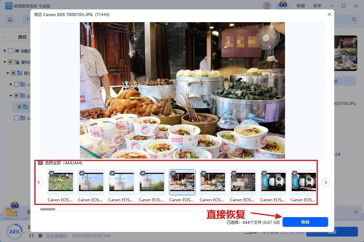 在掃描完成后,通過預覽確定了需要恢復的數據后,勾選這些數據,然后點擊軟件界面上的“恢復”按鈕。此時,軟件會提示您選擇一個保存恢復數據的位置。