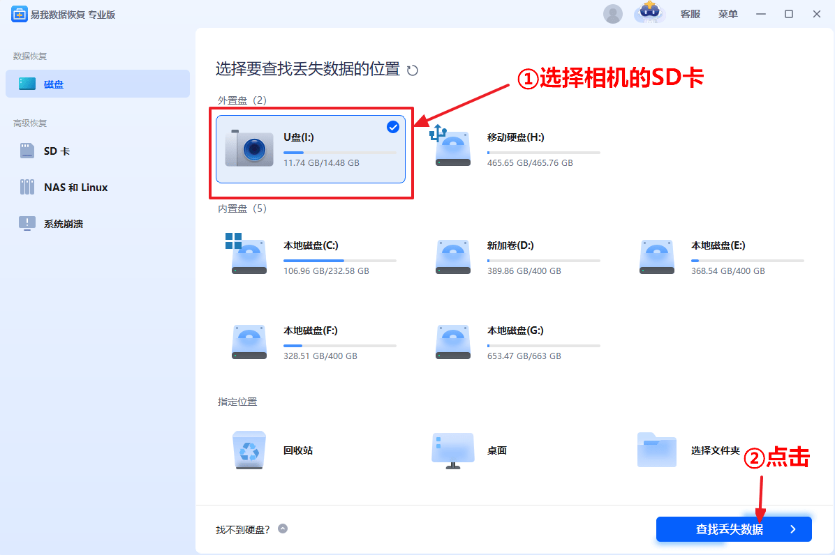 使用讀卡器將SD卡與電腦成功連接,確保電腦能夠識別SD卡。然后運行易我數據恢復軟件,在軟件主界面中,您會看到左側列出了各種存儲設備,包括硬盤、U盤以及連接的SD卡等。在這些設備中,找到并選中您需要恢復數據的SD卡,接著點擊界面上的“查找丟失數據”按鈕,軟件隨即開始對SD卡進行全面掃描,尋找丟失的數據。