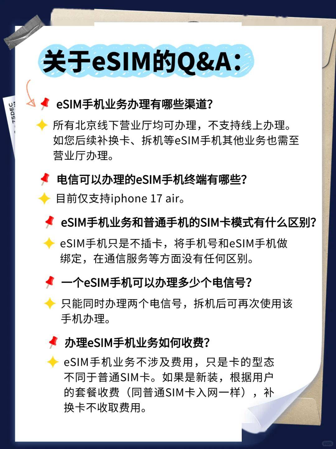 9 月 10 日消息,北京電信今晚通過官方小紅書賬號宣布,其已經(jīng)具備 eSIM 開通能力,9 月 19 日隨 iPhone Air開售同步上線體驗,套餐資費、權(quán)益不變。