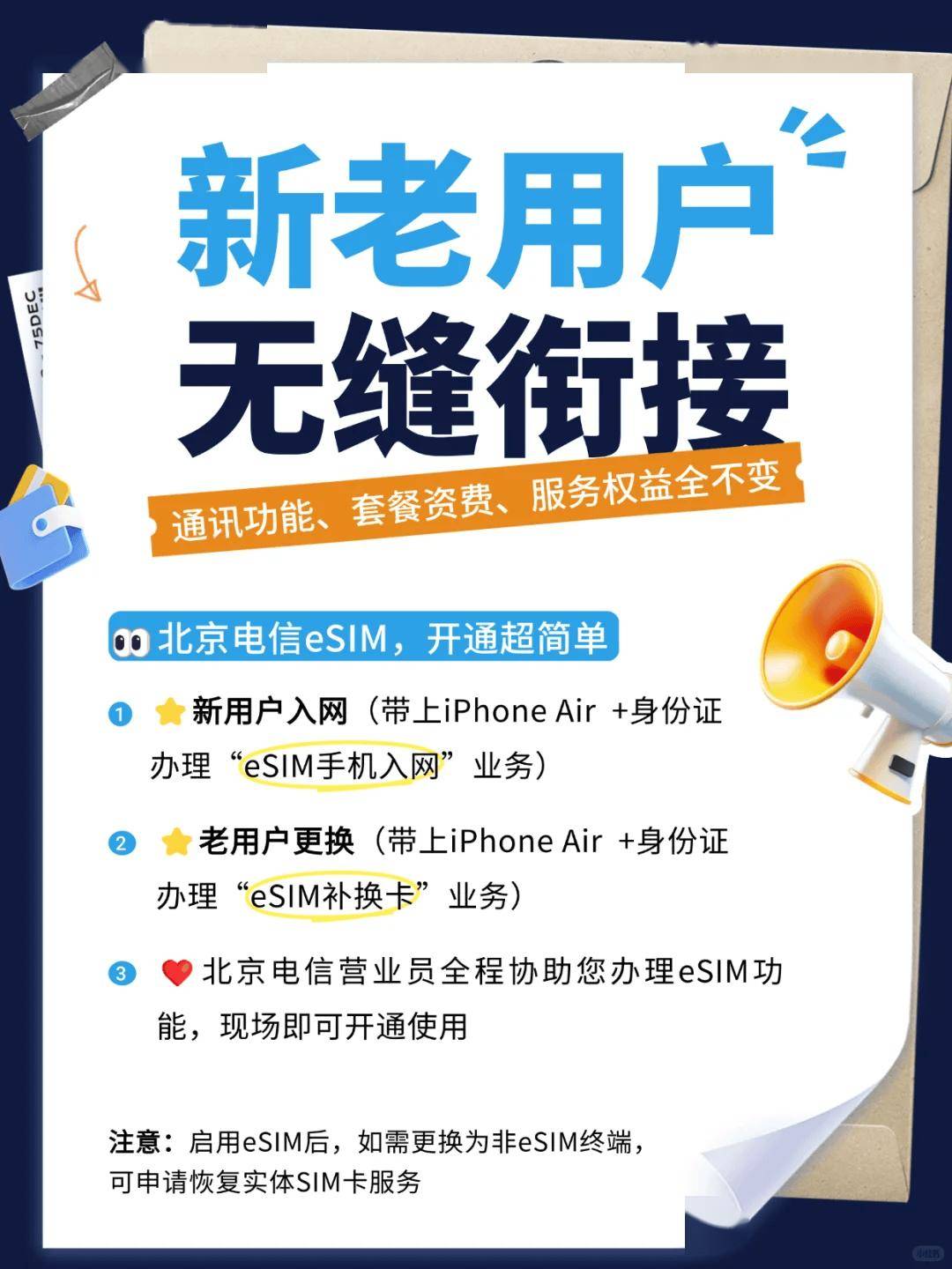 - 老用戶更換:帶上 iPhone Air + 身份證,辦理“eSIM 補換卡”業(yè)務(wù)