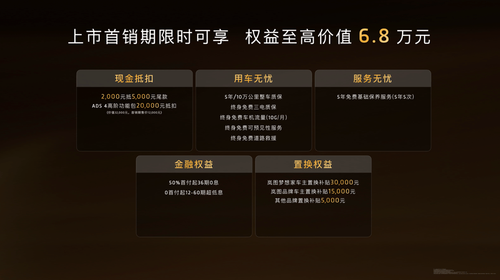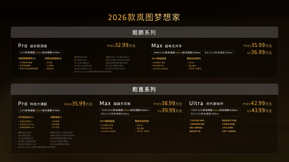 2025年9月15日,旗下高端MPV車型——嵐圖夢想家2026款正式上市。新車發(fā)布了鯤鵬版和乾崑版兩大智能化系列,并提供PHEV和EV兩種動力模式可選,多種配置的官方指導價格區(qū)間為32.99萬元-43.99萬元;同時,嵐圖官方還同步推出了至高價值6.8萬元的上市權(quán)益。作為煥新車型,2026款嵐圖夢想家同時搭載800V、5C超快充、62.5度大電池、華為ADS4、鴻蒙座艙5以及智能后輪轉(zhuǎn)向等多項領先技術(shù)。