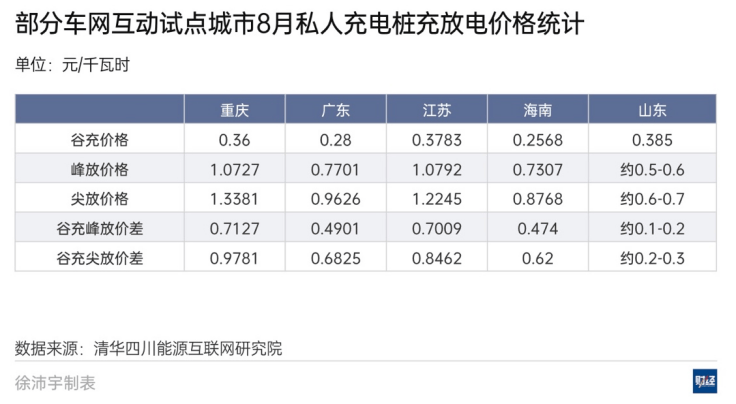 2025年4月國(guó)家發(fā)展改革委等四部門發(fā)布《關(guān)于公布首批車網(wǎng)互動(dòng)規(guī)模化應(yīng)用試點(diǎn)的通知》(下稱“首批試點(diǎn)通知”)后,各地陸續(xù)發(fā)布相關(guān)配套支持政策。其中,擴(kuò)大峰谷電價(jià)差是基石性的支持政策;目前,重慶、山東、廣東、江蘇、安徽、海南等省市針對(duì)V2G試點(diǎn)已出臺(tái)了專項(xiàng)上網(wǎng)電價(jià)試點(diǎn)政策,充放電價(jià)差最高接近1元/度。