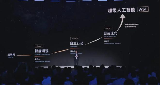 「實現 AGI(通用人工智能)已是確定性事件,但這只是起點。AI 不會止步于 AGI,它將邁向超越人類智能、能夠自我迭代進化的超級人工智能(ASI)。」吳泳銘在演講中開宗明義,并首次系統性地闡述了阿里眼中通往 ASI 的演進路線圖,這條路分為三個清晰的階段,構成了一套完整的「三級跳」理論。