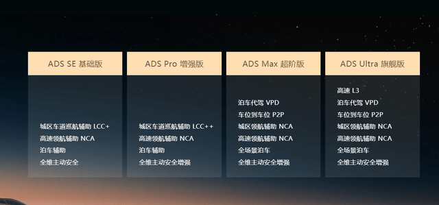 第二是輔助駕駛層面,由華為自研的激光雷達、車機芯片應該是9610系列、輔助駕駛芯應該是MDC610,整套軟硬件結合是華為的優勢,從目前的輔助駕駛能力看,華為賦能的車型有三種模式,ADS SE 無激光雷達版本主視覺方案,增強版,這個增強版應該就是5000元開通的功率等可以啟停,但是不能轉彎的模式,Max版本應該就是目前問界M7/8以及智界R7、深藍S09、傳祺向往S9、阿維塔07/06/11/12上的,而旗艦版,應該是問界M9和尊界乃至享界上的四激光雷達版本的。