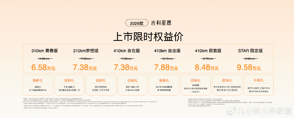 2026款吉利星愿上市限時權益價為6.58萬元–9.58萬元。同時為回饋用戶支持,同步推出八重限時購車權益,包括煥新禮、寵粉禮、繽紛禮、選裝禮、金融禮、流量禮、質保禮、補能禮,進一步降低擁車門檻,提升用車體驗。