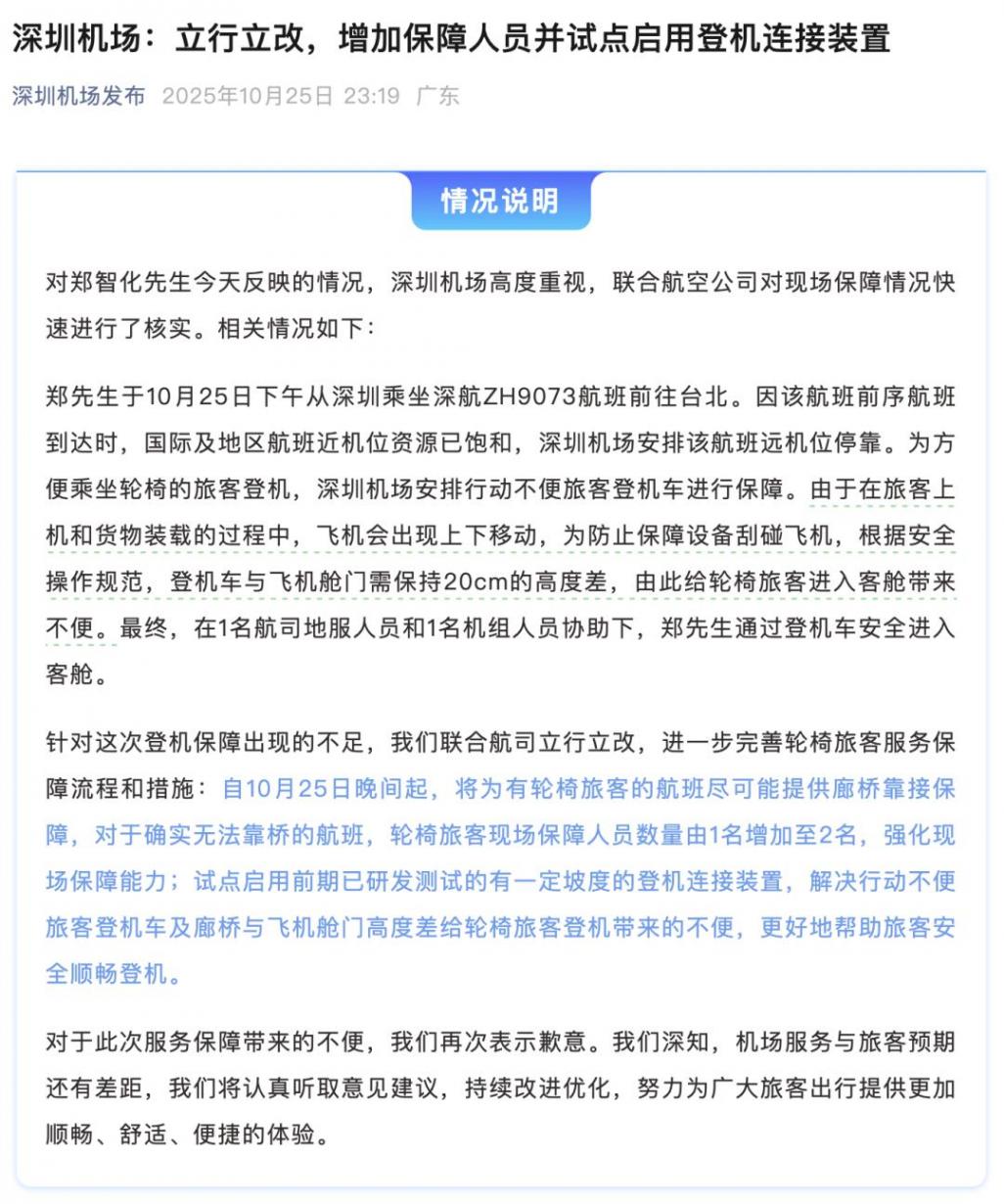10月25日晚,深圳機場發文稱將立行立改,增加保障人員并試點啟用登機連接裝置。全文如下: